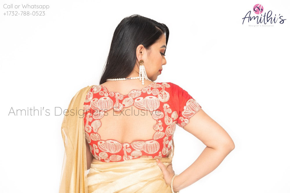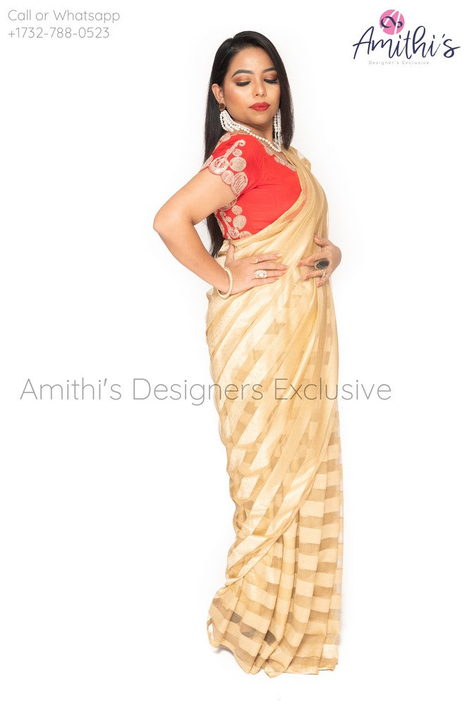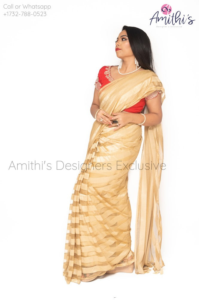 Saree : Classy Look shimmer gold Net fabric Saree . Blouse :Raw silk with instruments Zardosi hand work. Designed By Architha Narayanam.